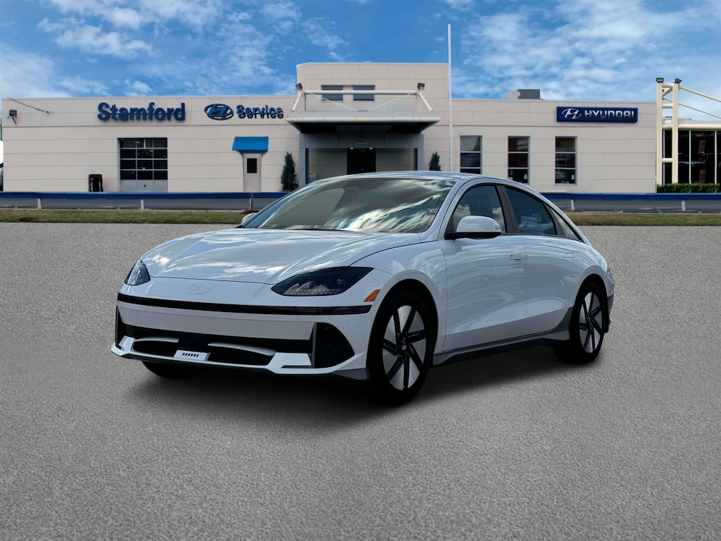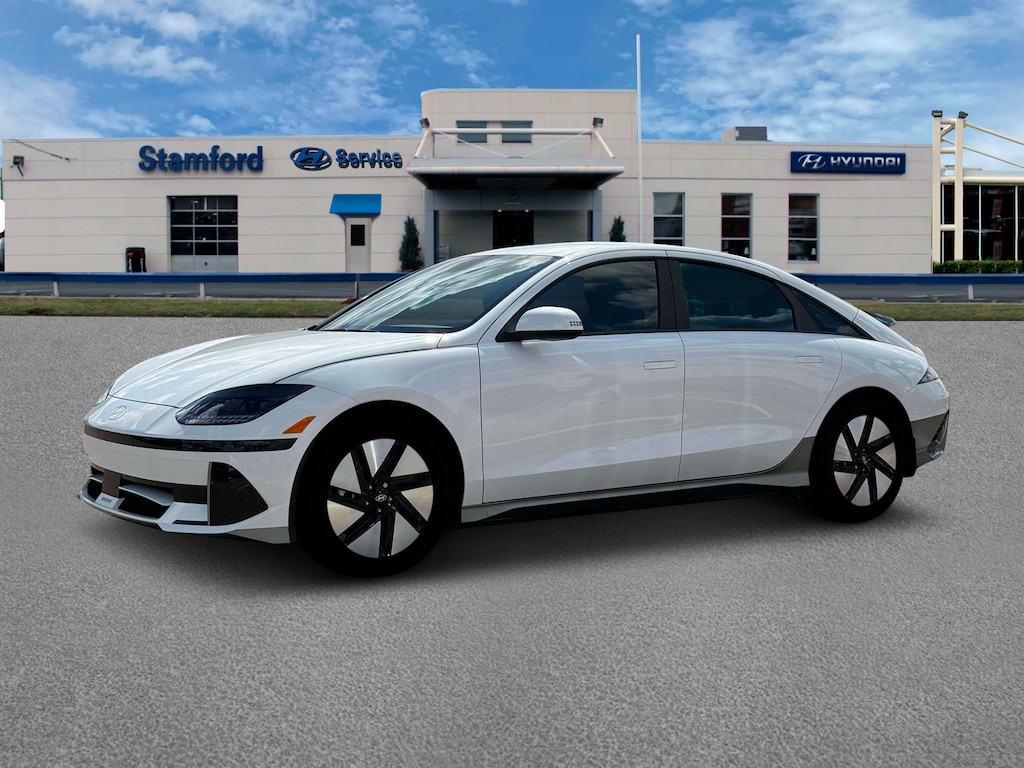 Serenity White 2025 Hyundai IONIQ 6 SE AWD 1-Speed Automatic Electric Motor 4-Wheel Disc Brakes, 6 Speakers, ABS brakes, Air Conditioning, Alloy wheels, AM/FM radio: SiriusXM, Apple CarPlay & Android Auto, Auto High-beam Headlights, Automatic temperature control, Brake assist, Bumpers: body-color, Carpeted Floor Mats, Delay-off headlights, Driver door bin, Driver vanity mirror, Dual front impact airbags, Dual front side impact airbags, Electronic Stability Control, Emergency communication system: Bluelink Connected Car Services (Bluelink+), Envelope Cargo Net, First Aid Kit, Four wheel independent suspension, Front anti-roll bar, Front Bucket Seats, Front Center Armrest, Front dual zone A/C, Front reading lights, Fully automatic headlights, harman/kardon® Speakers, Heated door mirrors, Heated Front Bucket Seats, Heated front seats, Illuminated entry, Leather steering wheel, Low tire pressure warning, Navigation System, Occupant sensing airbag, Option Group 01, Outside temperature display, Overhead airbag, Overhead console, Panic alarm, Passenger door bin, Passenger vanity mirror, Power door mirrors, Power driver seat, Power steering, Power windows, Radio: AM/FM/SiriusXM/HD Radio Audio System, Rear anti-roll bar, Rear Bumper Applique, Rear reading lights, Rear Reversible Cargo Tray, Rear seat center armrest, Rear window defroster, Remote keyless entry, Security system, Speed control, Speed-sensing steering, Split folding rear seat, Spoiler, Stain-Resistant Cloth Seating Surfaces, Steering wheel mounted audio controls, Telescoping steering wheel, Tilt steering wheel, Traction control, Trip computer, Turn signal indicator mirrors, Variably intermittent wipers, Vehicle to Load Adapter, Wheels: 18 x 7.5J Alloy.