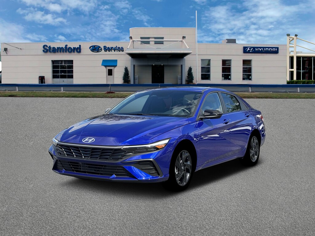 Intense Blue 2026 Hyundai Elantra Hybrid SEL Sport FWD 6-Speed Dual Clutch I4 4-Wheel Disc Brakes, 6 Speakers, ABS brakes, Air Conditioning, Alloy wheels, AM/FM radio: SiriusXM, Apple CarPlay & Android Auto, Auto High-beam Headlights, Automatic temperature control, Brake assist, Bumpers: body-color, Delay-off headlights, Driver door bin, Driver vanity mirror, Dual front impact airbags, Dual front side impact airbags, Electronic Stability Control, Emergency communication system: Bluelink+, Exterior Parking Camera Rear, Front anti-roll bar, Front Bucket Seats, Front Center Armrest, Front dual zone A/C, Front reading lights, Front wheel independent suspension, Fully automatic headlights, Heated door mirrors, Illuminated entry, Low tire pressure warning, Navigation System, Occupant sensing airbag, Option Group 01, Outside temperature display, Overhead airbag, Overhead console, Panic alarm, Passenger door bin, Passenger vanity mirror, Power door mirrors, Power steering, Power windows, Premium Cloth Seat Trim, Radio: AM/FM/HD/SiriusXM Display Audio, Rear side impact airbag, Rear window defroster, Remote keyless entry, Security system, Speed control, Speed-sensing steering, Spoiler, Steering wheel mounted audio controls, Tachometer, Telescoping steering wheel, Tilt steering wheel, Traction control, Trip computer, Variably intermittent wipers, Wheels: 17 x 7.0J Gloss Black/Dark Finish Alloy.