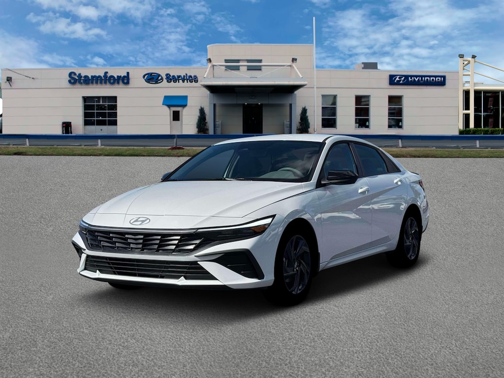 Serenity White 2026 Hyundai Elantra SEL Sport FWD CVT I4 4-Wheel Disc Brakes, 6 Speakers, ABS brakes, Air Conditioning, Alloy wheels, AM/FM radio, Apple CarPlay & Android Auto, Auto High-beam Headlights, Automatic temperature control, Brake assist, Bumpers: body-color, Delay-off headlights, Driver door bin, Driver vanity mirror, Dual front impact airbags, Dual front side impact airbags, Electronic Stability Control, Exterior Parking Camera Rear, Front anti-roll bar, Front Bucket Seats, Front Center Armrest, Front dual zone A/C, Front reading lights, Front wheel independent suspension, Fully automatic headlights, Illuminated entry, Low tire pressure warning, Occupant sensing airbag, Option Group 01, Outside temperature display, Overhead airbag, Overhead console, Panic alarm, Passenger door bin, Passenger vanity mirror, Power door mirrors, Power steering, Power windows, Premium Cloth Seat Trim, Radio: AM/FM/HD Display Audio, Rear side impact airbag, Rear window defroster, Remote keyless entry, Security system, Speed control, Speed-sensing steering, Spoiler, Steering wheel mounted audio controls, Tachometer, Telescoping steering wheel, Tilt steering wheel, Traction control, Trip computer, Variably intermittent wipers, Wheels: 17" x 7.0J Alloy Gloss Black w/Dark Finish.