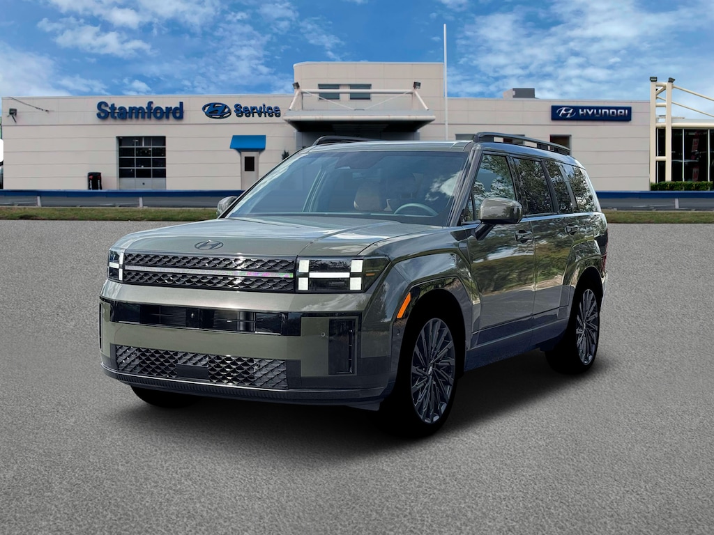 Rockwood Green 2026 Hyundai Santa Fe Calligraphy AWD 8-Speed Automatic with SHIFTRONIC 2.5L I4 12 Speakers, 3rd row seats: bench, 4-Wheel Disc Brakes, ABS brakes, Air Conditioning, Alloy wheels, AM/FM radio: SiriusXM, Apple CarPlay & Android Auto, Auto High-beam Headlights, Auto-dimming Rear-View mirror, Automatic temperature control, Brake assist, Bumpers: body-color, Cargo Cover/Screen, Cargo Net, Carpeted Floor Mats, Delay-off headlights, Driver door bin, Driver vanity mirror, Dual front impact airbags, Dual front side impact airbags, Electronic Stability Control, Emergency communication system, Exterior Parking Camera Rear, First Aid Kit, Four wheel independent suspension, Front anti-roll bar, Front Bucket Seats, Front Center Armrest, Front dual zone A/C, Front reading lights, Fully automatic headlights, Garage door transmitter: HomeLink, Heads-Up Display, Heated & Ventilated Front Bucket Seats, Heated door mirrors, Heated front seats, Heated rear seats, Heated steering wheel, Illuminated entry, Knee airbag, Leather steering wheel, Low tire pressure warning, Memory seat, Mudguards, Navigation System, Occupant sensing airbag, Option Group 01, Outside temperature display, Overhead airbag, Overhead console, Panic alarm, Passenger door bin, Passenger vanity mirror, Power door mirrors, Power driver seat, Power Liftgate, Power moonroof, Power passenger seat, Power steering, Power windows, Quilted Premium Nappa Leather Seat Trim, Radio: AM/FM/HD Bose Premium Audio System, Rain sensing wipers, Rear anti-roll bar, Rear side impact airbag, Rear window defroster, Rear window wiper, Remote keyless entry, Roadside Assistance Kit, Security system, Speed control, Speed-sensing steering, Split folding rear seat, Spoiler, Steering wheel mounted audio controls, Tachometer, Telescoping steering wheel, Tilt steering wheel, Traction control, Trip computer, Turn signal indicator mirrors, Variably intermittent wipers, Ventilated front seats, Wheels: 21" x 8.5J Unique Dark Finish Alloy.